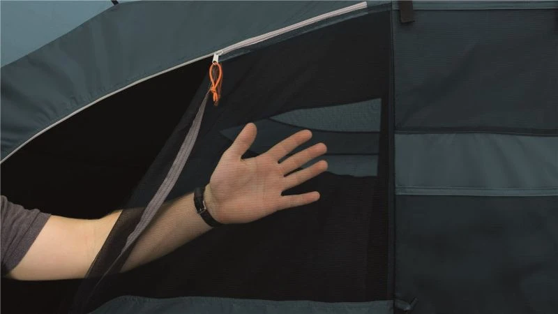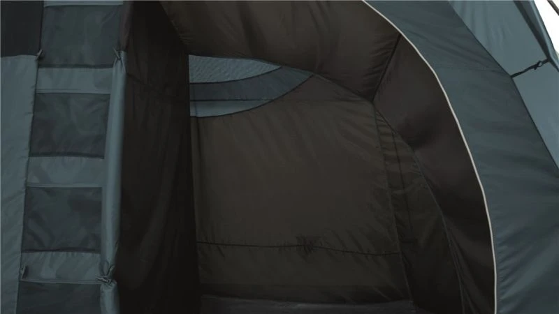 A solid 3,000mm HH waterproof rating is a great spec for the price point and as it has a sewn-in groundsheet the tent inside is sealed away from the wind and rain. Colour co-ordinated poles make it easy to pitch, as seen from our Attwoolls Pitching videos. The bedroom compartment is made from Easy camp’s sleep tight material to reduce early morning light and hopefully you don’t wake you when the sun rises. The inner also has storage pockets built into the tent to allow you to locate torches and phones in the middle of the night. Windows are located on either side of the tent to give a view outside and curtains can toggle up into place to provide privacy when needed. Covered ventilation panels are located behind the bedroom section at each end of the tent to increase airflow and help reduce condensation. A toggled inner divider splits up the bedroom section and can be easily removed to make one big sleeping space.