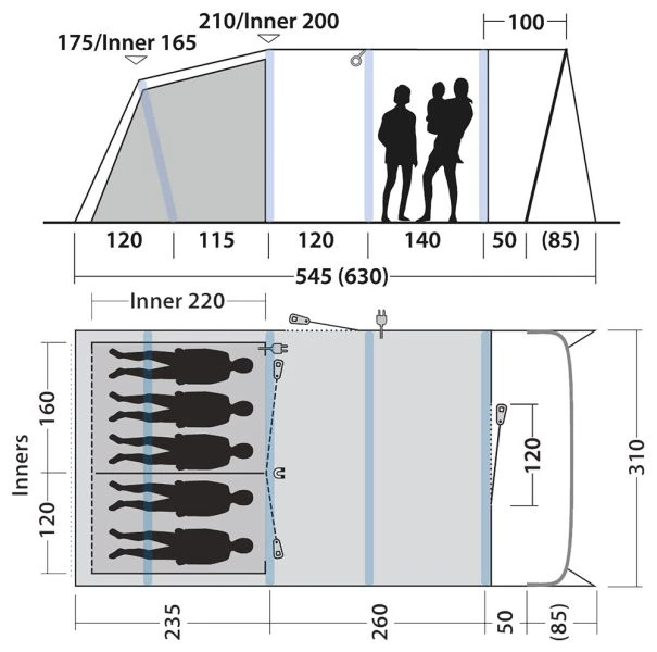 The tent features a rigid air frame system which allows the entire tent to be pitched within 10 minutes as seen from our Attwoolls Pitching & Packing Video. Each beam is inflated individually and as standard the tent comes with a decent manual pump. Large windows allow plenty of light into the tent, and toggle up curtains provide privacy when needed. Toggled dividers in the bedroom sections give a visible partition, so everyone is able to have their own space. Whereas storage pockets and cable entry points help to not only make the tent practical but also to utilise your space efficiently.