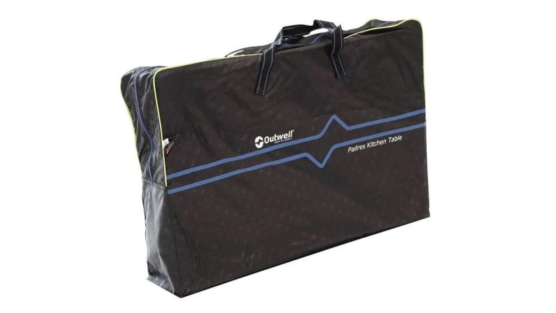 The Outwell Padres XL Kitchen Table in a stylish two-tone fabric with a solid bamboo table top, featuring three handy hooks on one side and a storage pocket on the other. The kitchen table includes a ‘pull-out’ holder for a washing bowl or rubbish bag, and a windshield to protect burner flames. Perfect for cooking your camping meals!