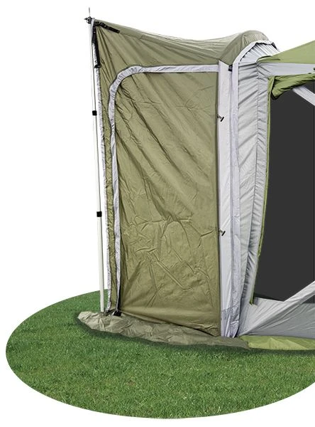 The Screen House Connector will fit vehicles with attachment height of 180-210cm, not only this but you can use zip the additional sun canopy directly onto the connector so you can have the option of just a sun canopy on the vehicle. There are two doors located in the tunnel section of the attachment so that you can get access to the van without having to go through the gazebo. there is also an additional fibreglass pole which comes with the connector to help raise the height of the tunnel so that the rain water can flow in the right direction.