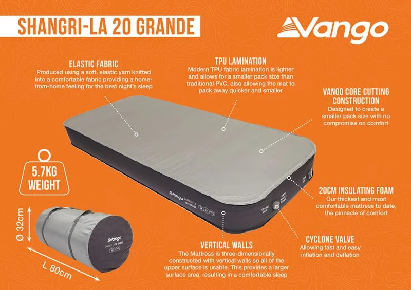 The Vango Shangri-La II 20 Grande is the pinnacle of Vango’s self-inflating mat collection. It features their unique core cutting construction to create a smaller pack size without compromising on the incredible comfort, and a newly designed carry bag for easy packing and transportation.