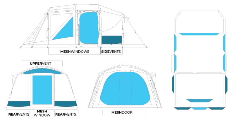 - Awning Features – 3 Stage Door, Awning Poles Included, All-Weather Access, Extended Awning Area, Roll Up Awning Door, Removable Anchor Webbing, Rain Skirt Fold Away Toggles, Rain Skirt, Gullwing Awning, Twin Access Awning Doors