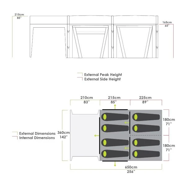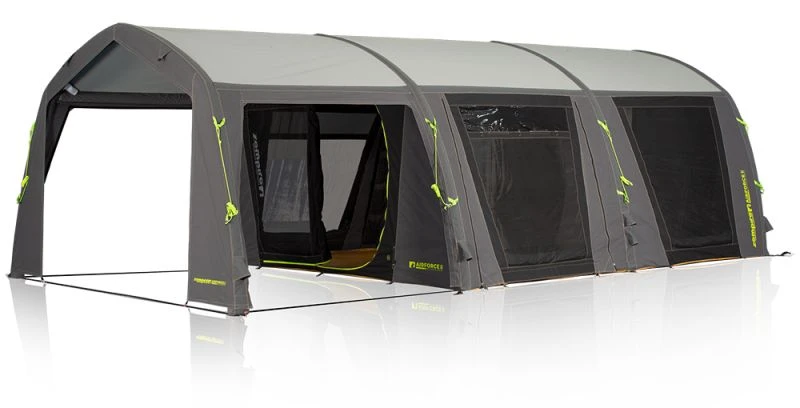 The AirForce has a built-on sun canopy which on this latest model is also inflatable. If you wished to extend your weathertight area there is always the option of purchasing the Canvaslite Sunroom which effortlessly zips into the canopy to enclose the space. The AirForce 1 V2 can sleep up 10 people but we really see it as a very comfy 4 berth tent or if you really wanted to you could house another 4 guests easily by sleeping them in the middle living area.